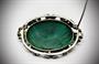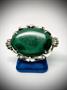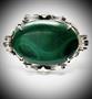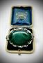 Výrazná, stříbrná brož s oválným, tmavě zeleným a velmi kvalitním malachitem. Stříbro ryzosti 925/1000, váha: 17,1 g. Velikost: 3,5 x 5,5 cm.