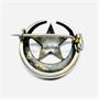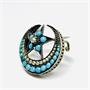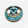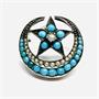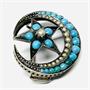 Půvabná, velmi stará brož tvaru půlměsíce s hvězdou. Šperk byl vyroben na konci 19.století ze stříbra ryzosti 800/1000, jehla obecný kov. Dominantou jsou přírodní tyrkysy kontrastně dozdobené říčními perlami. Průměr 2,5 cm. Výrazný, autentický šperk ve výborném stavu.