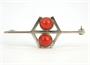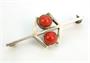 Art deco brož ze stříbra ryzosti 835/1000 (punc zajíc)zdobená dvěma korály. Rozměry 4,7 x 1,9 cm. Celková hmotnost 8,60 g.