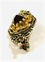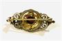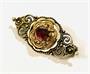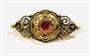Honosná starožitná stříbrná brož v historizujícím stylu, jíž dominuje velký přírodní granát routového brusu, který je osazen na zlaceném stylizovaném květu, jež je v žádoucím kontrastu s tělem brože, které je tvořeno z filigránových volut, motivu květů a místy doplněno o kuličky zhotoveny technikou granulace. Půvabný a dekorativní doplněk, navazující na produkci historizujících šperků na konci 19. století. Velmi kvalitní středoevropská zlatnická práce z druhé čtvrtiny 20. století.