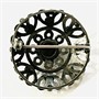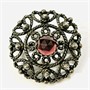 Honosná, kulatá brož osazena ve středu přírodním granátem kulatého routového brusu, prořezávané ornamentální tělo z křivek připomínající techniku filigránu, doplněno o vystupující granulované kuličky. Designem napodobující německý lidový šperk 18. a 19. století, německá zlatnická práce z poslední pětiny 20. století.