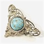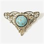 Dekorativní spona na šátek v neosecesním pojetí, centrální kulatá mugle brokátového skla napodobující tyrkys rámována pletencem, florálně komponované tělo s četnými průhledy. Nápaditá tuzemská zlatnická práce z první pětiny 21. století.