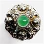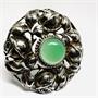 Výrazná prvorepubliková brož.Šperk byl zhotoven ze stříbra ryzosti 800/1000,jehla z funčních důvodů z obecného kovu. Zdobeno plastickým motivem růží,střed osazen chryzoprasem hladkého brusu kabošon. Celková váha 17,15 g. Průměr 4,5 cm. Šperk byl ponechán v původním stavu s půvabnou patinu.
