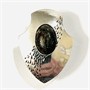 Moderní spona na šátek ve tvaru štítu, ve středu osazeno oválnou muglí přírodního heliotropu, zdobeno vinutým gravírováním připomínající cestu ze stop. Nápaditá tuzemská zlatnická práce z první pětiny 21. století.