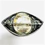 Nevšední, sbírková brož ze stříbra. Dominantou šperku je tmavé dřevo inkrustované stříbrem a perletí v červánkových odstínech. Jemnost tohoto dekoru podtrhují dramaticky plastické stříbrné části do kterých je oválné dřevo zasazené. Šperk byl zhotoven ze stříbra netradiční ryzosti 840/1000. Jehla obecný kov. Celková váha 23,50 g. Rozměry 7,5 x 4,6 cm. Autorská značka. Osvědčení puncovního úřadu. Výborný stav.