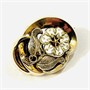 Menší, honosnější brož z období pozdního biedermeieru, objemné tělo ve tvaru asymetrického rokaje s florální aplikací, květ zdobený bílým smaltem s jemně rytými lístečky. Středoevropská zlatnická práce z 3. čtvrtiny 19. století. Vyrobeno technikou dutého kovu.