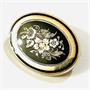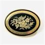 Dekorativní oválná brož z období biedermeieru, ústřední jemně rytý svazek květin v kontrastu s černým smaltem, který se opakuje i na obvodové linii. Kvalitní západoevropská práce z poloviny 19. století. Zhotoveno tehdy hojně užívanou technikou plněného foukaného kovu (schaumgold).