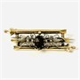 Elegantní, historizující brož, jejíž tělo je tvořeno třemi rovnoběžnými dříky, dekorativní aplikace s motivem volut a listů osazena tmavším přírodním granátem oválného brusu, doplněno přírodními bílo-šedými perlami. Kvalitní západoevropská zlatnická práce ze 70. ž 80. let 19. století. Vyrobeno technikou dutého kovu.