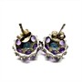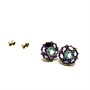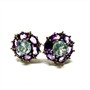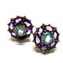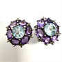 Půvabné stříbrné náušnice se zapínáním na puzetu s drahými kameny seskupenými do květu. Vyrobeny ze sterlingového stříbra (925/1000), o celkové váze 2,79 g. Střed šperku je osazen blankytně modrým topazem, který rámují fialové ametysty. Průměr 1 cm. Velmi dobrý stav.