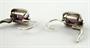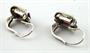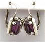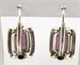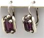 Stříbro, fialové skleněné kameny. Ryzost Ag 900 /1000, celková hmotnst 2,8 gramů. Jablonecká bižuterie. Stříbrné náušnice obdélného tvaru s klenutým úchytem na dámský patent. Náušnice zdobené postranními hladkými svislými plochami a kuličkami v horní a spodní části. Uprostřed vsazený fialový broušený skleněný kámen připomínající přírodní ametyst. Značeno : československý punc hlava zajíce s číslem 3, značka výrobce. Československo od roku 1957. Výška 20 mm.