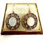 Půvabné, závěsné náušnice. Zhotoveny ze zlaceného stříbra sterlingové ryzosti (925/1000). Celková váha 7,85 g. Náušnice jsou na středu osazeny měsíčním kamenem hladkého brusu kabošon, po obvodu 8 tanzanitů. Délka 3,4 cm. Perfektní stav.