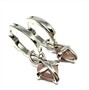 Variabilní, stříbrné náušnice. Masivnější ovály zdobí odnímatelná, kinetické závěsy s růženíny vybroušenými do tvaru srdce. Možnost nošení separátně. Náušnice byly zhotoveny ze sterlingového stříbra (925/1000), o celkové váze 6,45 g. Délka cca 3 cm. Půvabný, příjemně nositelný šperk v perfektním stavu