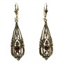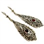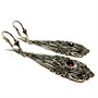 Velmi půvabné, delší, závěsné stříbrné náušnice. Zdobeny drobnými, elegantními markazity a kontrastně almandinem hladkého brusu kabošon. Sterlingové stříbro (925/1000), váha 5,29 g. Délka 5 cm. Některé z drobných markazitů chybí, viditelné lupou, nikoliv při nošení - výrazně zohledněno v ceně.