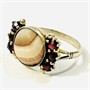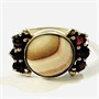 Elegantní prsten z období art-deco, hlavici dominuje kulatá mugle přírodního vřídlovce, po stranách doplněno českými granáty kulatého šachovnicového brusu a granulovanými kuličkami, fasováno zrnitou obrubou a zrnkovou technikou. Moderní design v kombinaci dvou typických českých minerálů, tuzemská granátnická práce z 30. let 20. století.