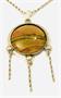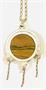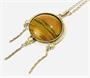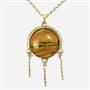 Větší autorský závěs inspirovaný tvaroslovím geometrické secese. Dominantou je kulatý leštěný krajinný jaspis hnědo-červeného zbarvení. Rámeček zušlechtěn vavřínovým gravírováním, dolní část opatřena geometrickými výstupky s řetízkovými ověsky. Připojen řetízek vazby "pancr". Originální ateliérová klenotnická turnovská práce z 90. let 20. století.