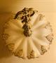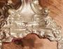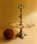 Stříbrný biedermeier luxusní nástolec , noha z tepaného stříbra zdobená ornamenty a rozmanitými volutami a motivy lastur, mísa ze skla vrstveného opakním bílým a členitě zabrušované okraje ,zlaté malované ornamenty v plochách mísy, Ag btto 486 g , západní Evropa , dobový lotový punc, výška 24 cm, průměr skleněné misky 19 cm; sběratelsky zajímavé