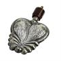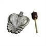 Stříbrný flakon ve tvaru srdce, zdobený gravírováním, s bakelitovým uzávěrem. V uzávěru zachována tyčka na aplikování parfému.