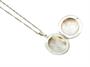 Závěsný otevírací kruhový medailon na fotografie ze stříbra ryzosti 925/1000 zdobený po obvodu rytím. Průměr 3 cm. Celková hmotnost 13,95 g. Délka řetízku 49 cm.