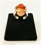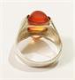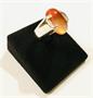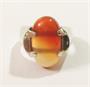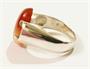 Moderní stříbrný prsten s minimalisticky pojatou šínou protaženou až ke krapnám držícím oválnou mugli karneolu, který svou intenzitou přechází od červené až k bělavě oranžové. Netradičně zpracovaný nadčasový šperk. Zhotoveno ze stříbra vysoké ryzosti 950/1000; punc S-61 (kozlík 2), ryzostní číslo z vnitřní strany. Hmotnost je 8,10 g. Velikost prstenu je 59. Délka kamene je 17 mm. Ve velmi dobrém stavu.