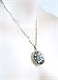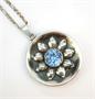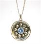 Náhrdelník ze stříbra ryzosti 800/1000 zdobený modrým spinelem s motivem květiny. Délka řetízku 51 cm. Průměr závěsu 3,7 cm. Celková hmotnost 17,66 g.