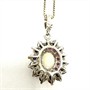 Půvabný stříbrný náhrdelník - řetízek typu kostka s odnímatelným závěsem bohatě zdobeným drahými kameny. Šperk byl vyroben ze stříbra sterlingové ryzosti (925/1000), o celkové váze 6,18 g. Závěs je osazen oválným opálem, které rámuje mezikruží drobných rubínu. Kontrastně dozdobeno tmavě modrými safíry. Drahé kameny jsou přírodního původu. Šperk disponuje velkým, rozevíratelným očkem, díky němuž lze zavěsit i na náhrdelník z drahých kamenů. Délka řetízku 45 cm. Výborný stav.