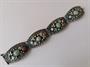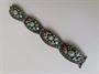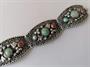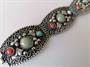 Starožitný stříbrný náramek v orientálním stylu osazený tyrkysy a mořskými korály, zhotoven ze stříbra 800/1000, celková hmotnost 33,70 g, délka 18,5 cm, max. šířka 2,7 cm.