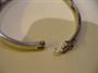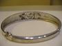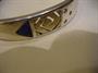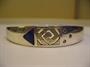Stříbrný oválný náramek zdobený lápisem lazuli, prořezávaným zlaceným středem a třemi čirými kamínky. Stříbro 925, celková hmotnost 23,6 g, vnitřní šířka oválu 6 cm, střed široký 1,3 cm.