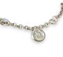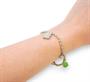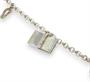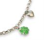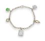 Náramek ze stříbra ryzosti 900/1000 (punc zajíc) "žebrák" s ověsky. Ryzostní číslo a mistrovská značka JB. Na ověsku ve tvaru otevírací knihy JV, další ověsky srdce, čtyřlístek, štír a podkova se srdcem. Smalt na podkově poškozen, na čtyřlístku je bezchybný. Délka 18 cm, celková hmotnost 10,50 g. Cca 1920-1930.