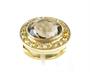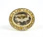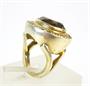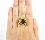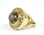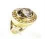 Stříbrný pozlacený prsten ryzosti 925/1000 zdobený centrálním hnědým kamenem, který je lemován kameny žlutými. Celková hmotnost: 12,94 g.