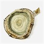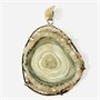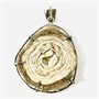 Extravagantní velký závěs, jehož dominantou je přírodní šedý kámen, patrně část achátové drúzy, jež upoutá svou spirálovitou strukturou. Fasováno krapnami v minimalistické rámečku. Neotřelý šperk s důrazem na organičnost, autorská nizozemská práce z poslední třetiny 20. století.