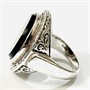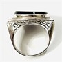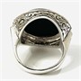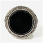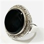 Robustní prsten koktejlového typu osazený přírodním černým onyxem kulatého plochého brusu fasovaném v plně přiléhající obrubě, rámeček i bok hlavice s plastickým reliéfem. Solidní západoevropská či i mimoevropská práce z poslední pětiny 20. století.