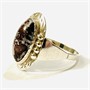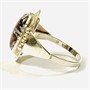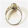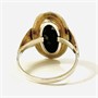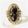 Elegantní prsten osazený přírodním červeno-bílým jaspisem zbroušeného do oválné mugle, fasováno v plně přiléhající obrubě, rámeček zdoben na každé straně 4 granulovanými kuličkami a zušlechtěn gravírováním, ramena šíny v podobě hladkých trojúhelníků. Kvalitní práce klenotnického družstva Kovozávody Turnov ze 60. až 70. let 20. století.