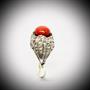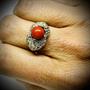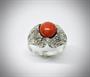 Stříbrný prsten ryzosti 835/1000, celková váha 5,45 g. Prsten zdobí kulatý korál červené barvy. Velikost: 53,5.