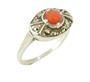 Jemný starožitný prsten ze stříbra ryzosti 835/1000 zdobený korálem a markazity. Velikost 53. Celková hmotnost 3,35 g. Čechy kolem roku 1925.