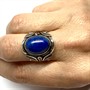 Půvabný, stříbrný prsten osazený oválným lápisem lazuli sytě modrého odstínu. Šperk byl zhotoven ze stříbra sterlingové ryzosti (925/1000). Celková váha 6,75 g. Velikost 55. Příjemně nositelný šperk ve výborném stavu.