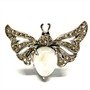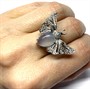 Výrazný, originální stříbrný prsten - motýl. Šperk byl zhotoven ze sterlingového stříbra (925/1000), o celkové váze 5,95 g. Šperku vévodí měsíční kámen hladkého brusu, křídla jsou osazena drobnými transparentními kameny diamantového brusu i brilance. Velikost 53. Perfektní stav.