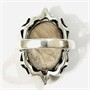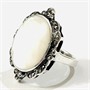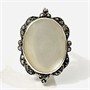 Elegantní prsten s hlavicí připomínající barokní kartuši, v plně přiléhající obrubě osazeno přírodní oválnou bílou perletí, jemný tvarově dekorativní rámeček v zrnitých lůžkách s fasovanými přírodními markazity kulatého hvězdicového brusu. Západoevropská či jihoevropská práce z poslední čtvrtiny 20. století.