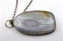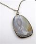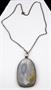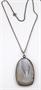 Stříbrný článkový řetízek, ryzost Ag 900 / 1000. Hmotnost 4,25 gramů. Značený : československý punc ( Hlava zajíce, číslo 3. , ryzost 900 ) . Oválný, plochý přívěsek nepravidelného tvaru. Rámeček z bílého lesklého kovu. Uvnitř vsazený leštěný přírodní achát. Celková hmotnost 11,30 gramů. Minulé století. Délka 26 cm.