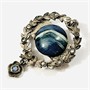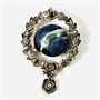 Nevšední přívěšek v novorenesančním tvarosloví, centrální kulatá mugle z modrého přejímaného skla, rámeček v podobě vavřínového věnce s mašlí osazen přírodními markazity kulatého hvězdicového brusu, květinový ověsek s kulatou muglí přírodního opálu. Přední i zadní strana zdobena rytím. Typická sedmihradská zlatnická práce z poslední třetiny 19. století.