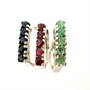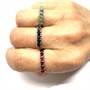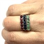 Půvabný, variabilní trojprsten - tři prsteny zdobené drahými kameny. Stříbro sterlingové ryzosti 925/1000, celková váha 7,44 g. Zdobeno modrými safíry, zelenými smaragdy a červenými rubíny. Drahokamy jsou přírodního původu. Regulovatelná velikost - současná 52. Výborný stav.