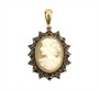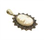 Půvabný závěs s kamejí ze zlaceného stříbra ryzosti 925/1000 lemovaný českými granáty. Přívěsku dominuje oválná kamej s bílo-oranžové přírodní mušloviny s profilovým portrétem elegantní dívky. Celková hmotnost šperku je 6,62 g. Délka závěsu je 4 cm. Kvalitní, česká zlatnická práce z 3. čtvrtiny 20. století. Ve výborném stavu.
