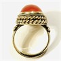 Výrazný, etnický "jedový" prsten, čímž je míněná ukrytá otevírací schránka v hlavici, ta je uvnitř zdobena stylizovaným florálním dekorem. Osazeno oválnou muglí přírodního karneolu, fasováno v plně přiléhající obrubě, rámováno řadou pletenců, masivnější šína s květy u hlavice. Kvalitní, patrně východoasijská práce z 2. třetiny 20. století.