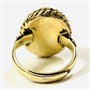 Zhotoveno ze zlaceného stříbra o ryzosti 950/1000; vyhotoveno osvědčení puncovního úřadu, značení "SILVER" zevnitř šíny. Hmotnost 10,51 g, nastavitelná velikost okolo 56, délka hlavice 21 mm, šířka 18 mm. Ponecháno s jemnou přirozenou patinou, zlacení místy lehce setřeno, celkově v zachovalém stavu.