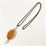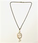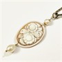 Výrazný, dekorativní náhrdelník tvořený přívěškem v pseudorenesančním stylu, tělo v podobě oválné kameje s florálními motivy, řezáno z přírodní bledě oranžovo-bílé mušloviny, doplněno o 2 přírodní kultivované perly nepravidelného kulatého a kapkového tvaru. Připojen odnímatelný řetízek atypické vazby blízké té "popcornové". Ruční italská (Arezzo) práce z přelomu 20. a 21. století.