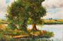 Pastózní olejomalba na plátně, koloristicky pojatá krajina. Letní motiv s loďkou ukotvenou ve stínu stromů v zátočině pod modrobílou oblohou. Dílo středního formátu od moravského malíře - Jaroslav KUČERA (*1885 Bystřice pod Hostýnem +1950 Hranice), převážně krajinář, navrhoval také gobelíny. Velmi pěkný původní rám, sig. a dat. 34 l.d. Obraz i rám v dobrém stavu ihned k vystavení v interiéru. Celkový rozměr 52 x 44cm, rozměr díla 40 x 32cm
