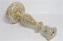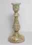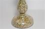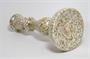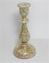 Svícen z čirého a velmi jemného dutého skla s pestrobarevným dekorem uvnitř. Sklo foukané do dřevěné formy na způsob amalgamového skla ( tzv. selské stříbro ), ale na vnitřní straně neobvykle dekorované drobným barevným pigmentem, sklářská práce z 2. poloviny 19. století. Dobrý stav, rozměr v. 22cm, prům. 10,5cm
