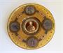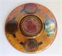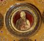 Skleněný talíř s dvojstěnným medalionem. Čiré sklo, žlutě lazurované, se zlatými rozvilinami a čtyřmi medailony černě malovanými na stříbrné půdě, Jellert, Hegel, Klopstock a Voss, s nasazenými kameny a perličky, ve dvě dvojstěnný medailon s portrétem Goetheho na zlaté půdě. Některé perličky chybí. Průměr 17 cm. 1. pol. 20. stol.