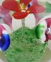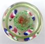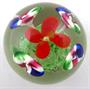 Bezbarvé a barevné sklo. Klenuté těžítko z bezbarvého skla. Uvnitř centrální červený květ. Čtyři postranní oválné pruhované květiny. Zelená základna se vzduchovými bublinami. Čechy 1900 - 1940. Výška 6 cm, průměr 7,5 cm.