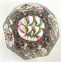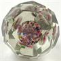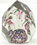 Čiré a barevné sklo, broušené. Větší těžítko z čirého skla s fazetami různých tvarů po obvodu. Uvnitř pět bílých květů s růžovými, zelenými, žlutými a černými pruhy. Čechy 1890 - 1930. Výška 11 cm.
