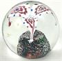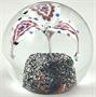Bezbarvé, bílé, a barevné sklo. Klenuté kulaté těžítko z bezbarvého skla s barevnou základnou pokrytou stříbřitými zrnky slídy. Uvnitř trojlist z bílého skla s růžovým středem s modrou tečkou v benátském stylu. Evropa minulé století. Výška 8 cm.